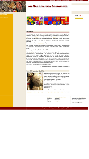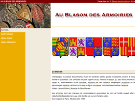au blason des armoiries : dictionnaire encyclopédique illustré des termes relatifs à la science du blason, aux institutions féodales, à la noblesse française. les pages comportent des milliers de dessins de blasons et permettent de consulter une base héraldique d'environ 700 000 blasons.