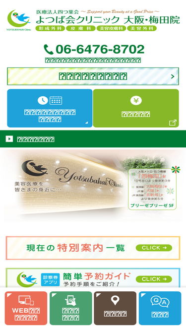 85%Q&A。大阪市北区梅田の形成外科、美容皮膚科、美容外科ならよつば会クリニック大阪・梅田院へ。大阪メトロ四つ橋線「西梅田」駅10号出口より徒歩約3分、阪神「大阪梅田」駅、JR「大阪」駅桜橋口、JR東西線「北新地」駅より徒歩約5分で、通院に便利です。ニキビ、しみ、しわ、たるみなどのお悩みから傷痕の治療まで、機能面だけではなく整容面、美容面にも配慮して治療を行います。