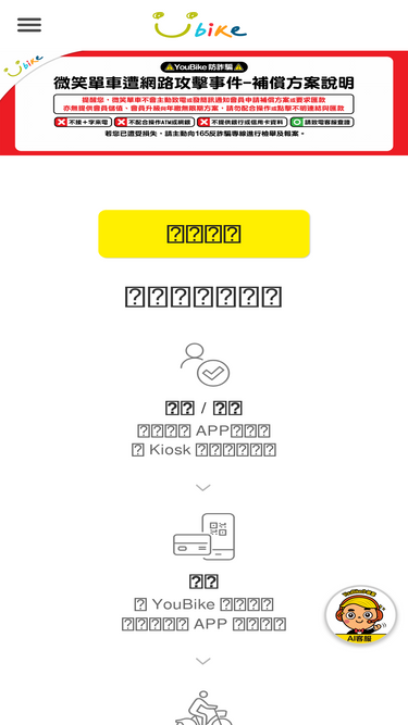 85%Welcome to YouBike 微笑單車, 推廣民眾騎乘自行車作為短程接駁交通工具,用慢速的方式體驗城市不同時空的迷人風情,不僅提供市民便利的接駁工具,同時還兼具了休閒運動與娛樂的特點,讓市民及遊客體驗騎乘自行車是一種生活與旅遊的最佳方式。