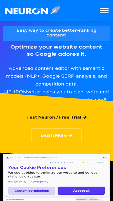 90%An easy way to create better-ranking content! Optimize your website content so Google & AI adores it Advanced content editor with semantic models (NLP), Google SERP analysis, and competition data. NEURONwriter helps you to plan, write and optimize content with user intent in mind! Innovative Brands We are trusted by brands across all industries NEURONwriter