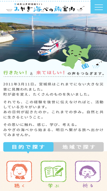 66%2011年3月11日。宮城県はこれまでにない大きな災害に見舞われました。あの日何が起きたのか。これまでの歩み。自然と共に生きるということ。その思いに触れ、感じ、学び、考える。みやぎの海べから始まる、明日へ繋がる旅へ出かけてみませんか。