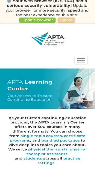 The APTA Learning Center offers comprehensive online courses and continuing education designed for physical therapists, physical therapist assistants, and students. Our offerings include certificate programs, webinars, and expert-led series to enhance your skills. Check out our course listing to find the right course for you.