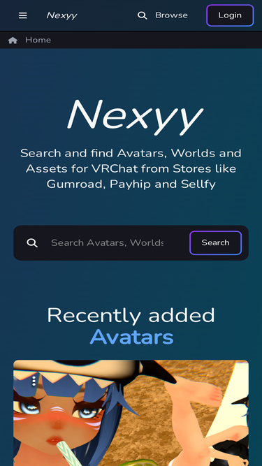 73%nexyy provides a simple search for free and paid avatars, assets, worlds and more for vrchat and other virtual reality platforms.