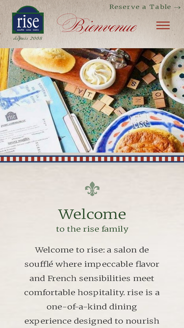 100%welcome to rise: a salon de soufflé where impeccable flavor and french sensibilities meet comfortable hospitality. rise is a one-of-a-kind dining experience designed to nourish your body and soul. we welcome you to dine with us and find out just what we mean.
