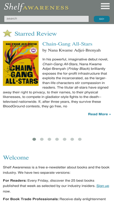 96%Welcome to the Web site for Shelf Awareness: Daily Enlightenment for the Book Trade, the free e-mail newsletter dedicated to helping the people in stores, ...
