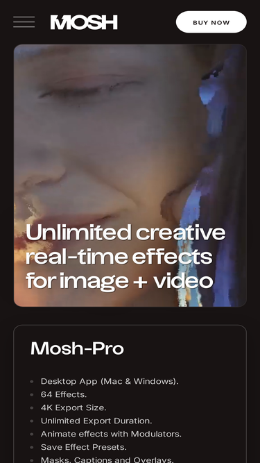 80%Unlimited creative real-time effects for image + video. Mosh-Pro is a fully featured desktop version of Mosh, including new effects, improved UI, high-res video export, modulators, audio-reactive effects and more.
