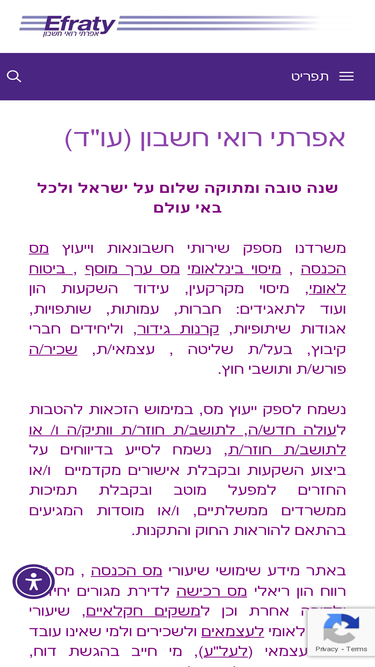 87%שנה טובה ומתוקה שלום על ישראל ולכל באי עולם משרדנו מספק שירותי חשבונאות וייעוץ מס הכנסה , מיסוי בינלאומי מס ערך מוסף , ביטוח לאומי, מיסוי מקרקעין, עידוד השקעות הון ועוד לתאגידים: חברות, עמותות, שותפויות, אגודות