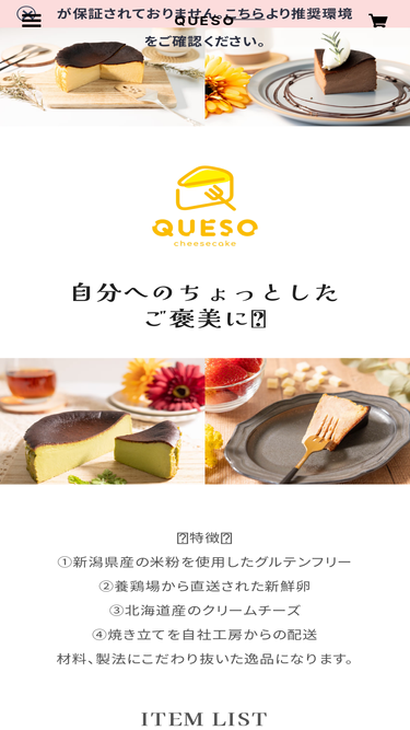 100%こんにちは、チーズケーキ専門店 QUESOです!誰でも安心して食べられ、「自分自身へのちょっとしたご褒美に」というコンセプトを元にオープンしたチーズケーキ専門店です!シンプルな食材で構成されるスイーツだからこそ厳選された食材を使用し半年以上をかけて試行錯誤したレシピで分量、焼き加減、手順の細部にまで調整を加えて完成した濃厚なチーズケーキです!またお客様にお届けするまでの「時間」という点も重要視しておりまして、食材の鮮度、出来立てをお送りする事にもこだわっております!食材は主に自然豊かな北海道産のクリームチーズと北海道産の濃厚生クリームに加え、日本一の養鶏場を誇る茨城県産の新鮮な採れたて卵を使用し小麦粉の代わりに新潟県産の米粉を用いて作られております。ちょっとした自分へのご褒美にご家族やご友人、大切な方と一緒に笑顔になって頂けたら幸いです!こだわり抜いた濃厚チーズケーキをどうぞご賞味ください。