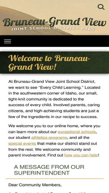98%at bruneau-grand view joint school district, we want to see “every child learning.” located in the southwestern corner of idaho, our small, tight-knit community is dedicated to the success of every child. involved parents, caring citizens, and high-achieving students are just a few of the ingredients in our recipe to success.