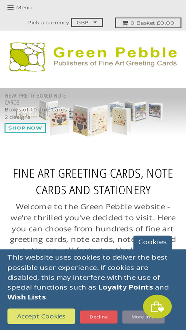 79%Green Pebble publishes original works of art produced by talented exhibiting British artists as high quality greeting cards, note cards and stationery products. Find our Frequently Asked Questions here.
