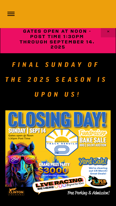 100%Clinton Raceway (located in Clinton, Ontario) offers harness racing, year round slots and a cafe. Also, has a picnic area and pool.