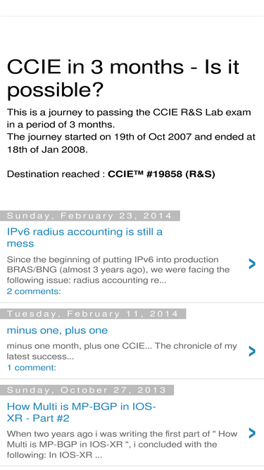63%This is a journey to passing the CCIE R&S Lab exam in a period of 3 months. The journey started on 19th of Oct 2007 and ended at 18th of Jan 2008. Destination reached : CCIE™ #19858 (R&S)