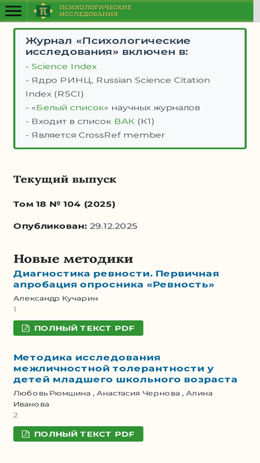 междисциплинарный научный психологический журнал 'психологические исследования' публикует оригинальные статьи по различным отраслям психологии и смежных наук. адресован профессионалам. цели журнала: распространение и популяризация научных психологических знаний, поддержка высоких стандартов научных исследований и публикаций, содействие интеграции российской психологической науки в мировое информационное научное пространство.