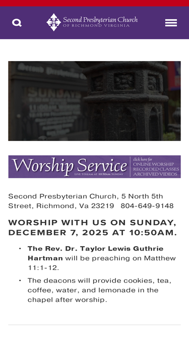 75%Second Presbyterian Church, PC(USA), Richmond, Virginia, is a dynamic, downtown, historic church, with a huge heart for mission to the city and into the world. We welcome all whom God calls into life, worship, work, and leadership of this church without regard to gender, cultural heritage, skin colo