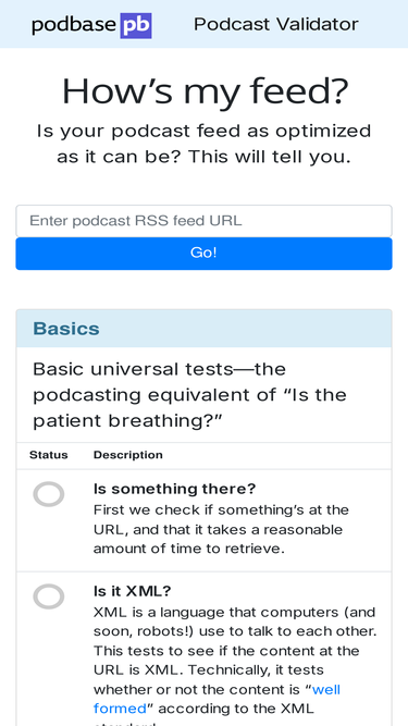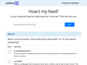 86%Submit your podcast RSS feed for analysis and get notified if there are issues with your feed, server, media, or artwork.