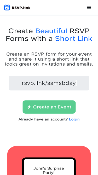 90%create beautiful rsvp forms and share them using a short link. easily create an event and download your responses as a csv file. perfect for weddings, showers, parties, small businesses, family reunions and much more.