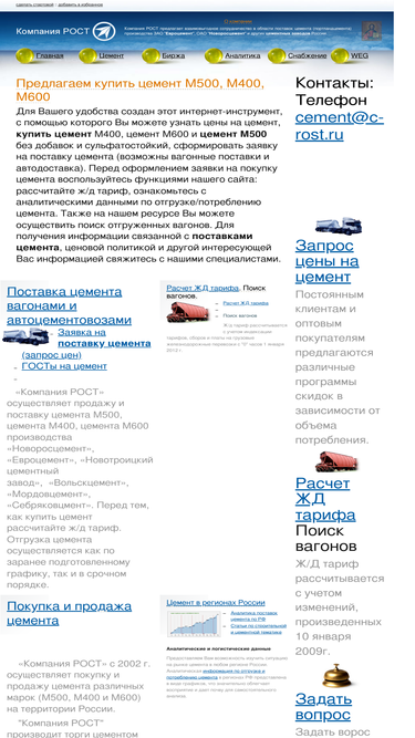 86%компания рост производит продажу цемента и оптовые поставки цемента м500 (м 500), м400 (м 400). цены на цемент снижены для оптовых покупателей. купить цемент оптом по низким ценам, можно оформив заявку на покупку цемента. продпжа цемента навалом, в мешках и биг бэгах. производство цемента на заводах новоросцемент и евроцемент. марки портландцемента: пц 600, пц 500, пц 400, м500, м400. расчет жд тарифа в вагонах оао первая грузовая компания. поставки цемента в москву, санкт-петербург, ростов, краснодар, сочи, новороссийск, ставрополь, астрахань, курск, казань, воронеж
