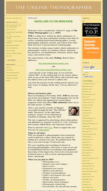 100%quick link to the main page - welcome! you've reached the "about us" page of the online photographer (a.k.a. top). top is a daily news website for photo enthusiasts, in blog format. our past contributors number more than 50 writers,...