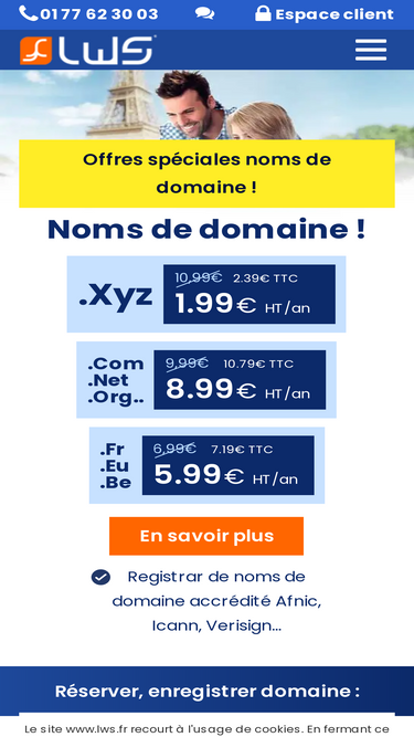 88%Achetez votre nom de domaine (.XYZ, .FR, .EU, .BE, .SITE, .COM, ...) à partir de 0,99€ par an avec hébergement web et adresses emails personnalisées incluses.
