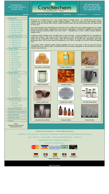 100%at candlechem, we carry a complete line of high quality, candle making supplies. our vast inventory has everything you will need, from candle wax and candle fragrances to candle wicks and candle molds, equipment & accessories, glassware, candle containers, additives & chemicals, candle coloring, warning labels and much more.