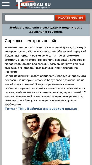 88%смотреть индийские, армянские, русские, турецкие, бразильские, мексиканские, азиатские сериалы онлайн бесплатно на teleseriali.ru.