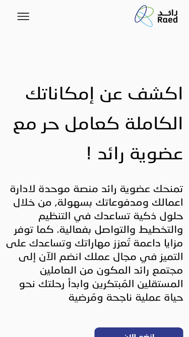 89%تمنحك عضوية رائد منصة موحدة لادارة اعمالك ومدفوعاتك بسهولة, من خلال حلول ذكية تساعدك في التنظيم والتخطيط والتواصل بفعالية. كما توفر مزايا داعمة تُعزز مهاراتك وتساعدك على التميز في مجال عملك انضم الآن إلى مجتمع رائد المكون من العاملين المستقلين المُبتكرين وابدأ رحلتك نحو حياة عملية ناجحة ومُرضية