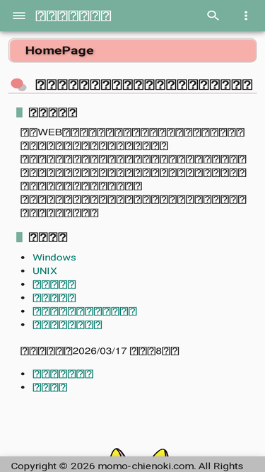 94%ももの知恵の樹(もものちえのき)は、プログラム言語やコンピュータ技術についての情報を記載しています。興味を持った技術情報、日々のシステムエンジニア業務で直面した問題、技術課題に対する調査結果などを備忘録としてコンテンツ化しています。その他にも、勉強したこと、趣味のことなども雑多に追記していく予定です。