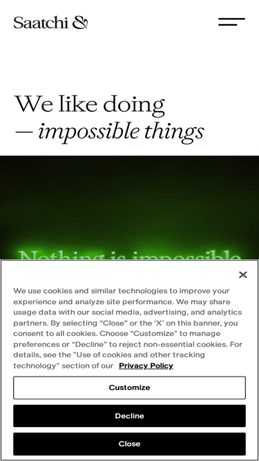 100%At Saatchi & Saatchi we like doing impossible things. Integrity is the foundation of our long-term success, We deliver and bring enjoyment