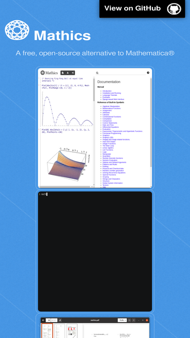 maxima is a fairly complete computer algebra system written in lisp with an emphasis on symbolic computation. it is based on doe-macsyma and licensed under the gpl free software license. its abilities include symbolic integration, 3d plotting and solving differential equations.