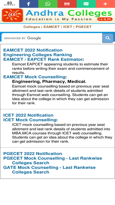 80%eamcet 2021 rank estimator mock counselling icet pgecet eamcet 2018 engineering & medical rank estimator, the complete information about colleges, institutes and universities in andhra pradesh and seminar topics, entrance exams, admission notifications, scholarships, eamcet/aieee/iit papers. colleges information of engineering, medical, bed, pharmacy, mba/mca, music, multimedia, fine arts, degree, pg, polytechnic, agriculture, bio-technology, animation.
