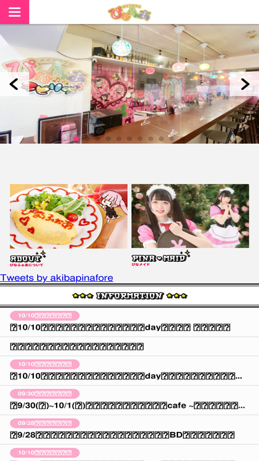 83%秋葉原にあるメイドカフェ・メイド喫茶「ぴなふぉあ」の公式サイトです。秋葉原に3店舗を展開しており、個性豊かなメイド達がご主人様のご帰宅をお待ちしております。アキバで最高の癒しをお届けするメイドカフェ「ぴなふぉあ」へ是非ご来店ください。
