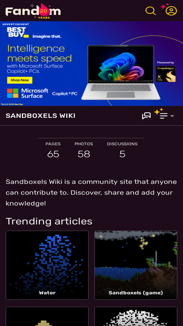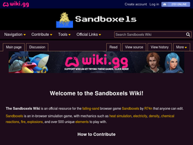 71%Welcome to the Sandboxels Wiki! The Sandboxels Wiki is an official resource for the falling-sand browser game Sandboxels by R74n that anyone can edit. Sandboxels is an in-browser simulation game, with mechanics such as heat simulation, electricity, density, chemical reactions, fire, explosions, and over...