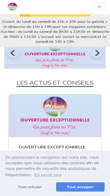 88%Des heures calmes sont désormais mises en place à My Place pour les personnes atteintes de troubles autistiques et leurs familles. Tous les mercredis, jeudis et vendredis de 13h à 14h, la musique est arrêtée et l'intensité lumineuse baissée dans la galerie marchande. Votre supermarché Auchan baisse