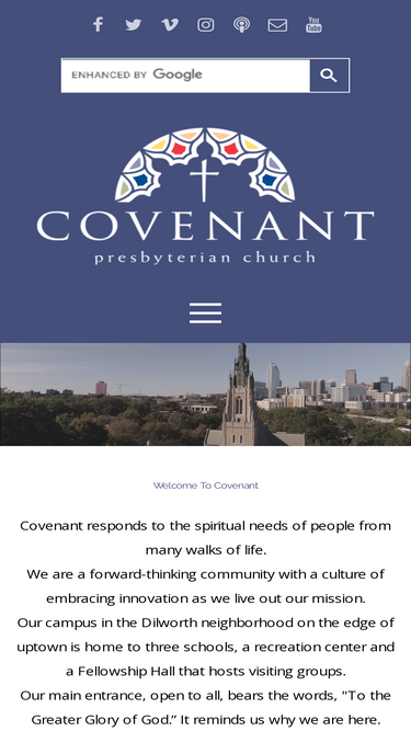 100%covenant presbyterian is a dynamic christian community thatâ gladly invites all people into a transformational experience of faith;â boldly proclaims the gospel; bravely works toward a whole and just world;â and passionately nurtures discipleship.