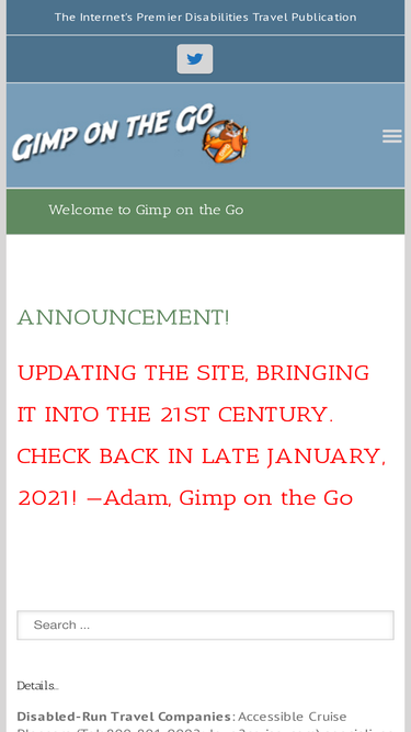 100%announcement! updating the site, bringing it into the 21st century. check back in late january, 2021! —adam, gimp on the go