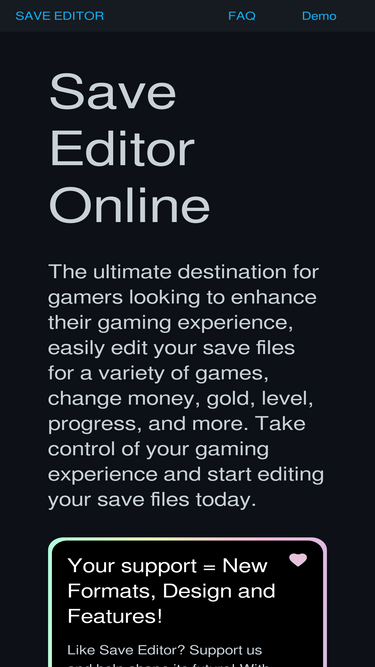 you can edit ren'py (.save), rpg maker mv (.rpgsave), rpg maker mz (.rmmzsave), rpg maker xp (.rxdata), rpg maker vx (.rvdata), rpg maker vx ace (.rvdata2), naninovel (.nson), json.