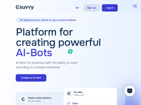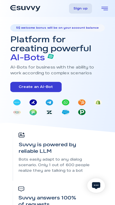 Smart chatbots based on artificial intelligence - Suvvy. He knows how to sell, consult, contact CRM and much more. Solves more than 95% of all requests. Suvvy has integration with WhatsApp, Kommo, Alteg.io and othrer s.