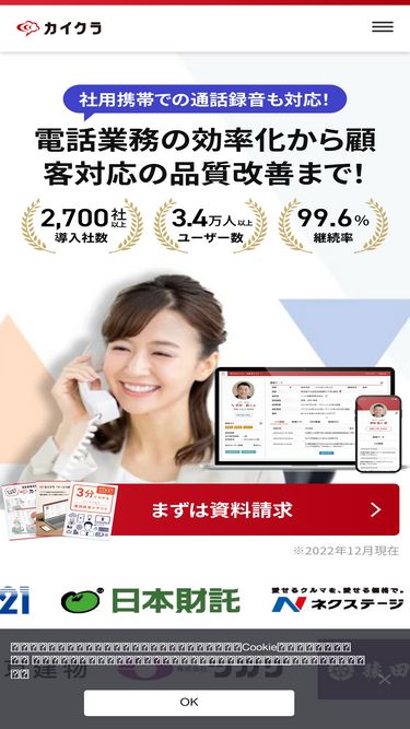 94%カイクラは電話、メール、ビデオ通話、SMSなどのコミュニケーションを一括管理できるプラットフォームです。顧客情報のポップアップ、通話中のメモ・履歴確認、自動通話録音・文字起こし機能付きで、業務効率アップと顧客対応の質を向上させます。