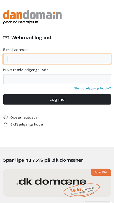 100%log ind på din dandomain webmail. på denne side har du mulig for at logge ind på din webmail, og tilgå dine ind- og udbakker. du kan også opsætte regler og autosvar.