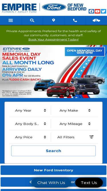 94%visit us and test drive a used ford, chevrolet, nissan, toyota or jeep in new bedford at empire ford of new bedford. our used car dealership always has a wide selection and low prices. we've served hundreds of customers from fairhaven, marion, dartmouth and acushnet.