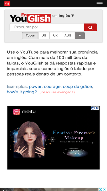 81%Struggling with Inglês pronunciation? YouGlish uses real people speaking real Inglês to help you master tricky sounds. No more dictionary confusion!