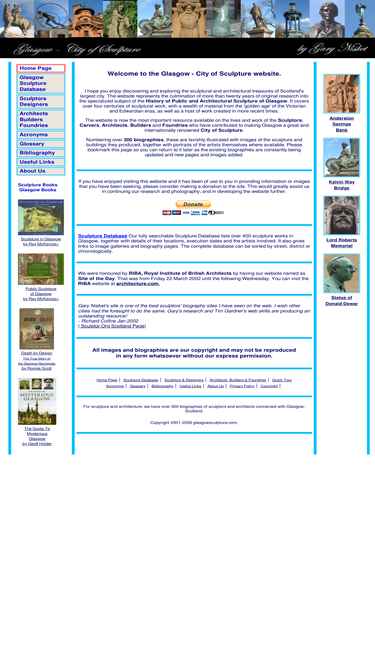100%glasgow - city of scuplture offers over 400 biographies of sculptors and architects, with hundreds of photographs, to make this an enjoyable and rewarding site for the casual visitor and an essential and authoritative reference work for the serious researcher.