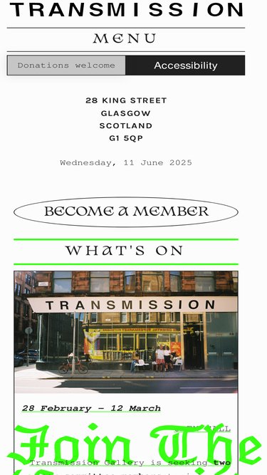 91%Transmission (est.1983) is an artist-run space in Glasgow.