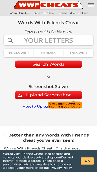 78%Words With Friends Cheat .IO is the only website to use SCREENSHOT reading technology! Its BOARD EDITOR and ANAGRAM SOLVER guarantee the top answers!