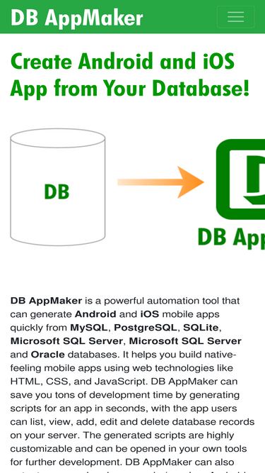 db appmaker is a powerful automation tool that can generate android and ios mobile apps quickly from mysql, postgresql, sqlite, microsoft sql server, microsoft sql server and oracle databases.