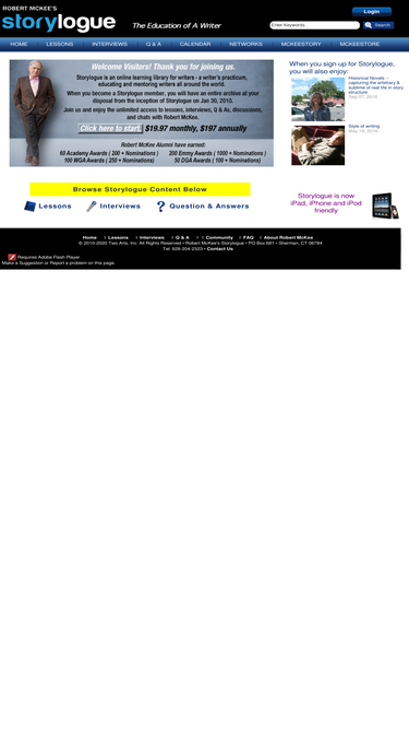 89%storylogue is robert mckee's ongoing, online arena for writers. robert mckee designed this website to enhance the skills of writers from all storytelling media - prose, television, theatre, film, journalism, documentary, graphic novel, advertising, and the like. in addition, storylogue embraces all story genres, whether character driven or action driven, from romance to war story, from adult drama to teen farce, from traditional broadway musical to avant-garde post-modern novel.