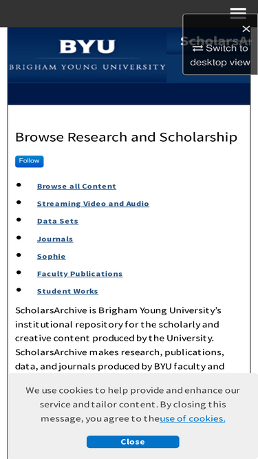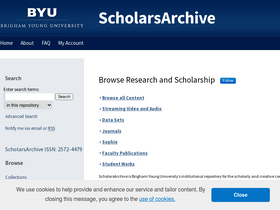 90%the mission of scholarsarchive is to support intensive learning, stimulating teaching, and excellent research by providing free, easy access to original scholarly and creative works produced by faculty, staff and students at brigham young university. in addition, scholarsarchive hosts online journals and conferences published or managed by byu departments. scholarsarchive upholds the university’s and harold b. lee library’s mission statements by simplifying the pursuit of lifelong learning and spiritual growth.