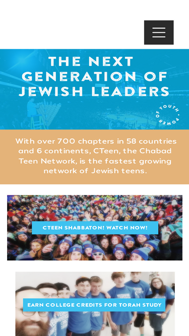 52%Our mission at CTeen is to provide a nurturing environment, fusing fun, friendship, humanitarian outreach, mitzvah observance, and engaging Torah study.