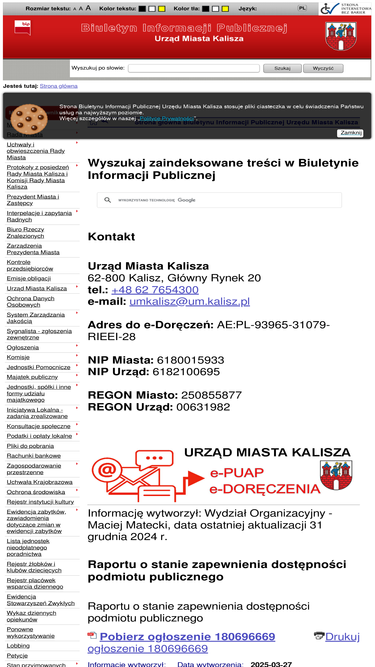 72%biuletyn informacji publicznej urzędu miejskiego w kaliszu. udostępnia informacje dotyczące pracy urzędu miasta kalisza, wymagane dokumenty, wzory dokumentów. odnaleźć można: obwieszczenia, treści uchwał rady miasta, zarządzenia prezydenta, strukturę organizacyjną urzędu, regulamin organizacyjny urzędu, oświadczenia majątkowe pracowników urzędu pełniących stanowiska kierownicze, radnych rady miasta kalisza, dyrektorów i kierowników jednostek organizacyjnych miasta. serwis umożliwia sprawdzenie stanu załatwianych spraw w urzędzie.