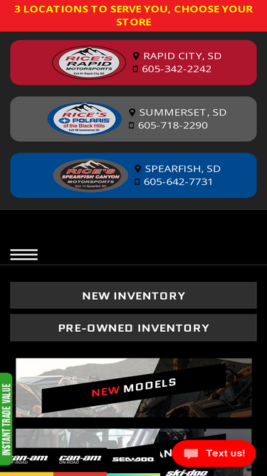 68%shop rice's rapid motorsports & polaris of the black hills in rapid city, south dakota for atvs, side x sides, motorcycles, dirt bikes, scooters, personal watercraft, snowmobiles & power boats for sale. dealers for can-am, honda, polaris, triumph, ktm, ski-doo, ssr & more.